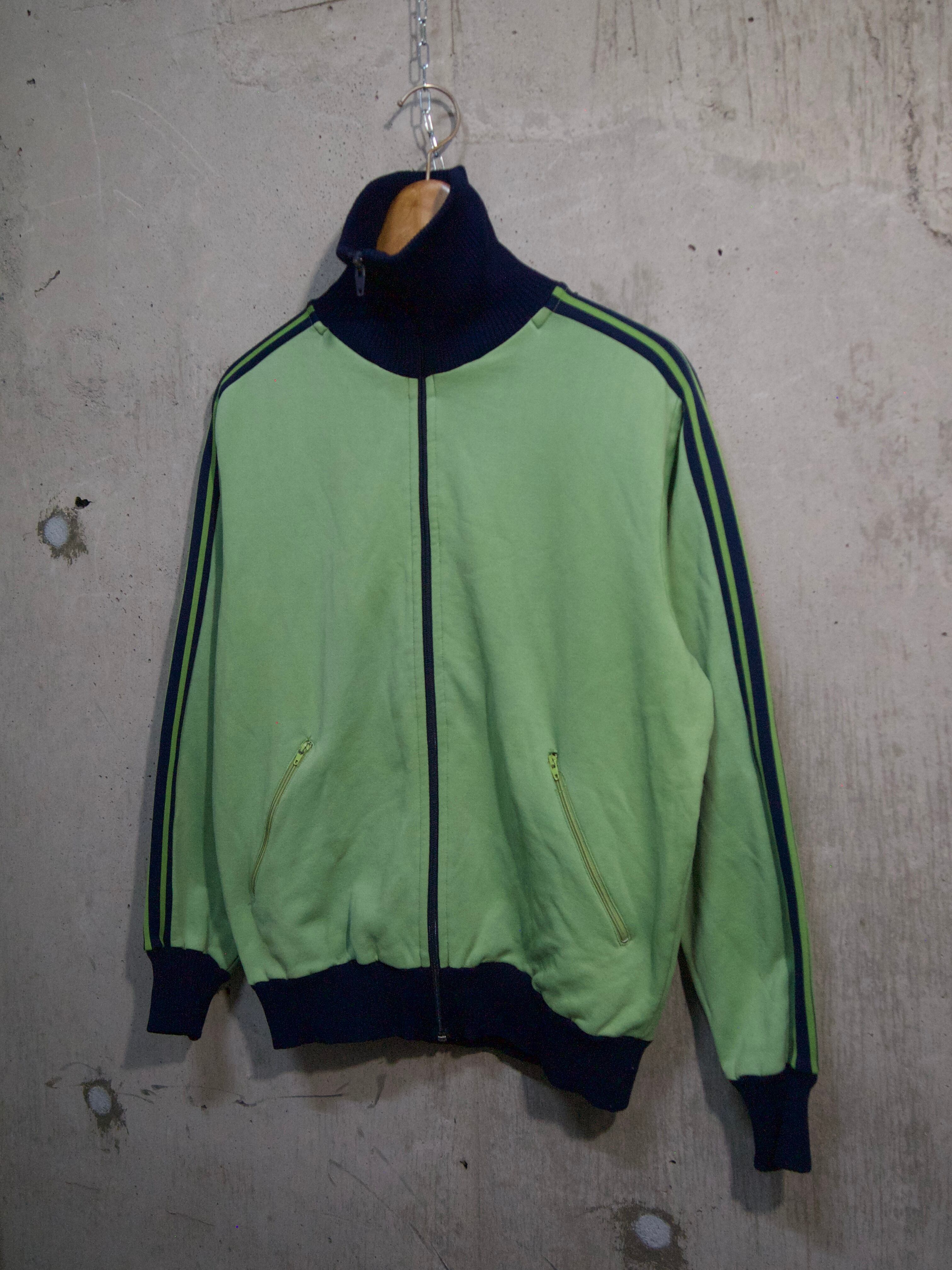 鮮やかなライトグリーン×ネイビーの切り替えが効いたハイネック仕様のトラックジャケット。